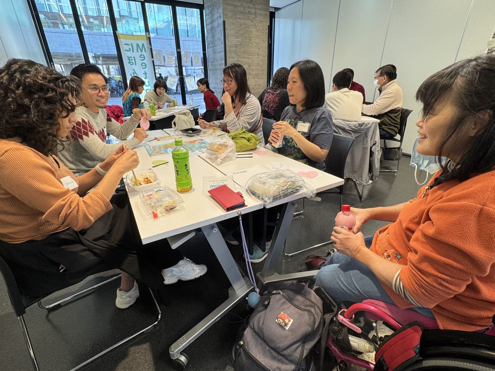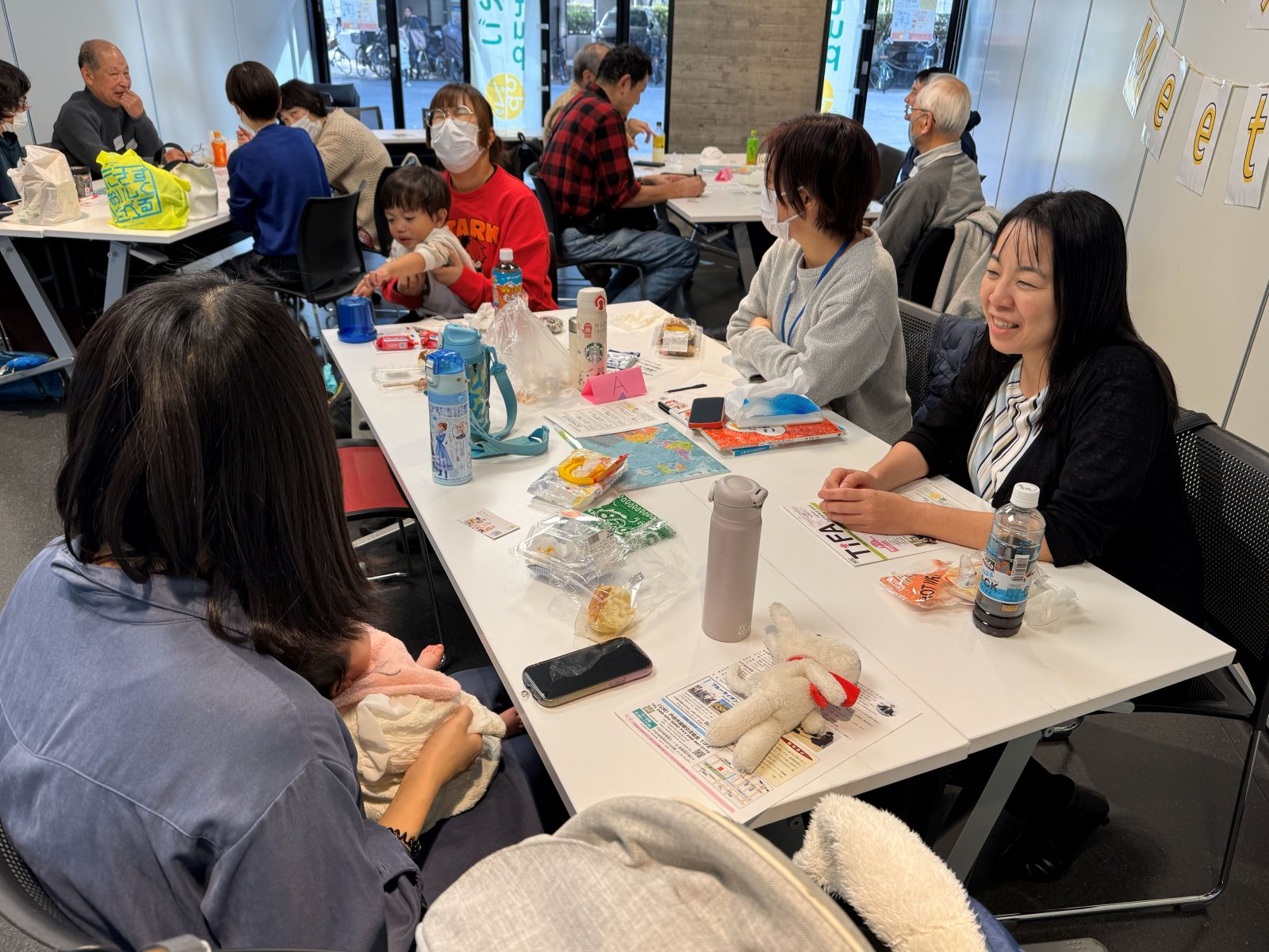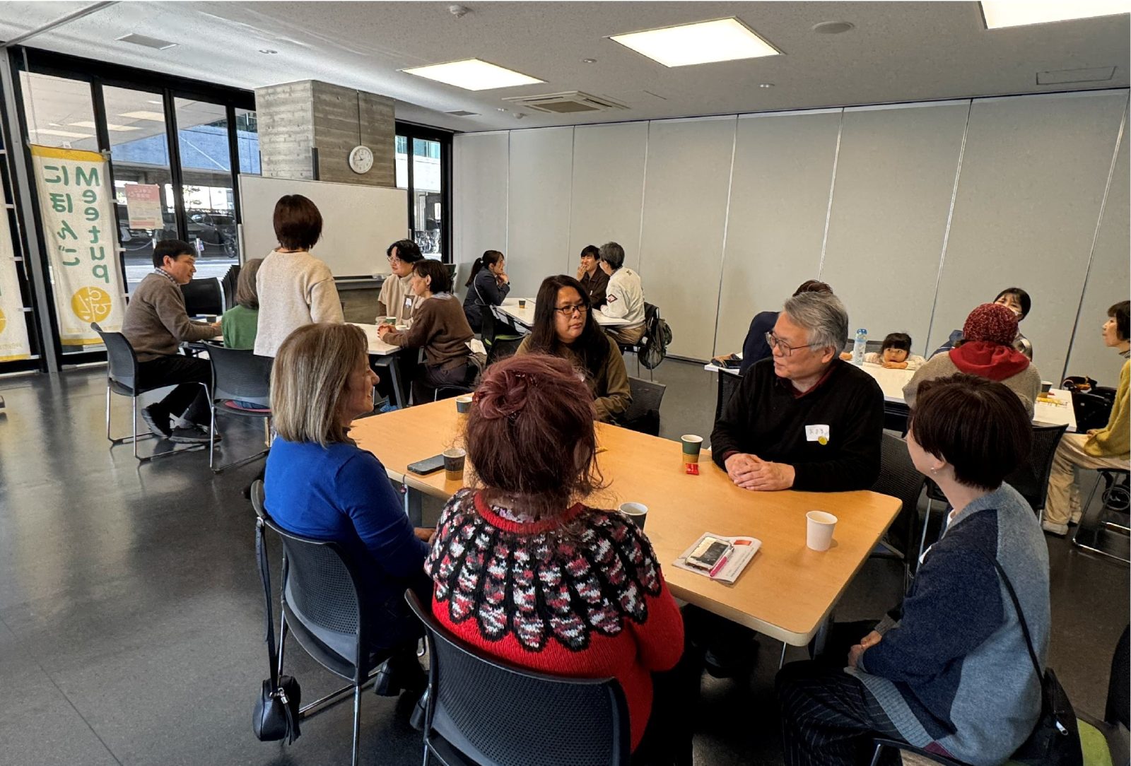 毎月一回、ランチをしながらの交流会です。外国籍の方たちは学んでいる日本語を用い、日本人はつたわりやすい「やさしい日本語」を意識しながら、互いの文化や習慣、通院や買い物、行政手続からゴミ出し、防災まで、様々なジャンルを話題にして交流します。少しの勇気とやさしさで多文化共生は育くまれます。