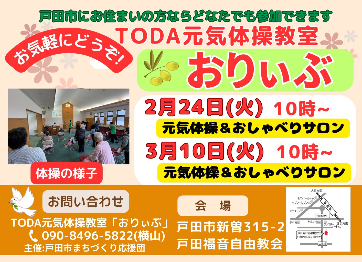 現在の活動は、市内在住の外国人の方たちとの交流の場『やさしい日本語交流会Meetup』と高齢の皆さんの健康維持と交流の場『TODA元気体操教室「おりぃぶ」』と「サロン・おりぃぶ」』です。これ以外にも活動を広げていきます。あなたのアイディアとやる気を応援します。一緒にまちづくりにチャレンジしてみませんか。