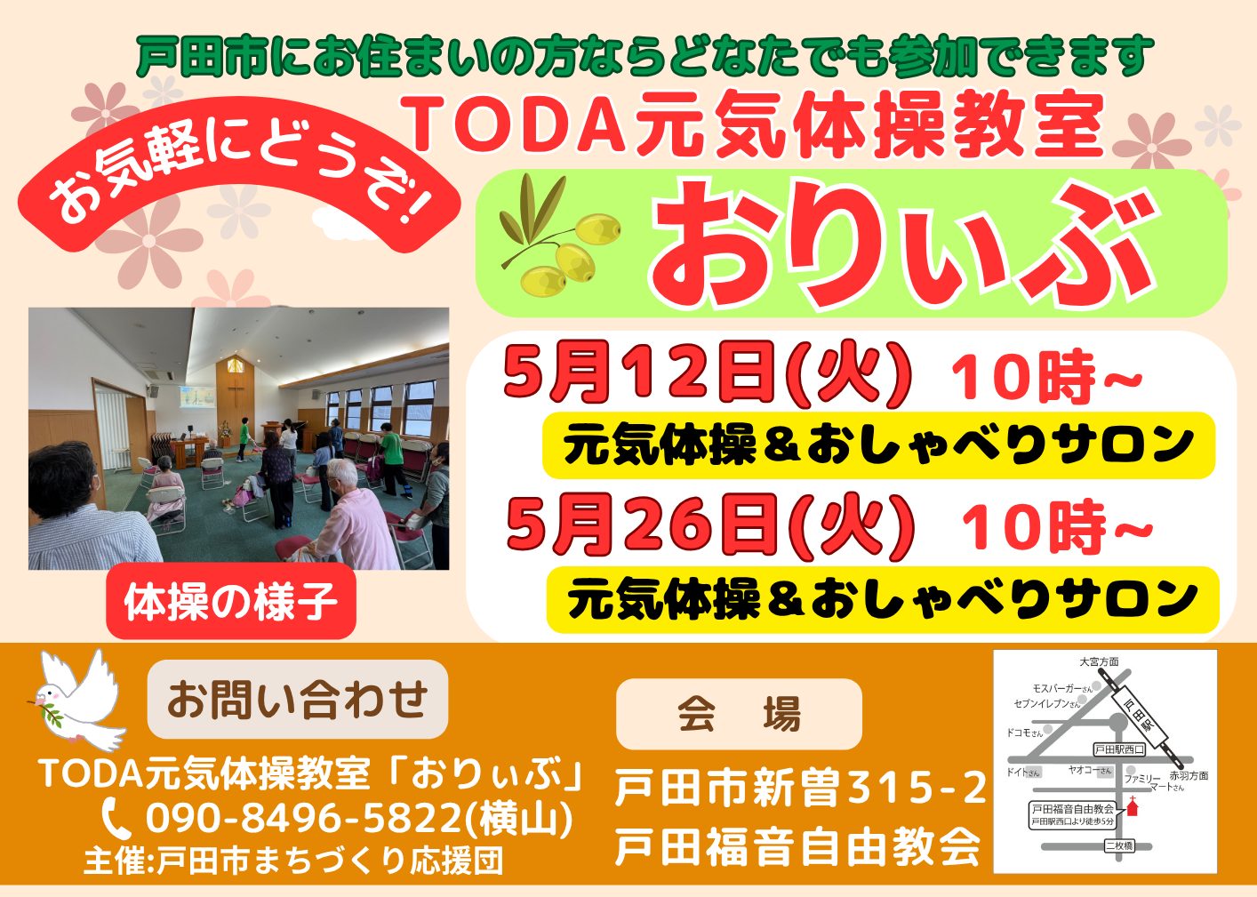 TODA元気体操教室「おりぃぶ」毎月第二、第四火曜日10時からです。 5月は12日(火)10:00~ と 26日(火)10:00~ です。 体操の後は、お茶を飲みながら「おしゃべりサロン」でお話ししましょう!!